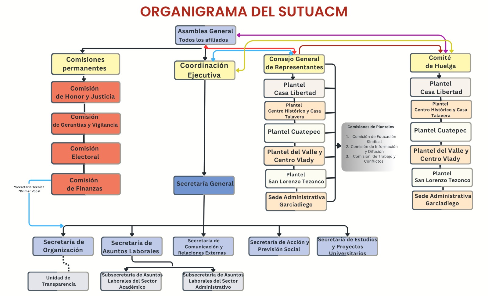Nuestra organización sindical se rige por principios democráticos, donde el poder reside en la Asamblea General, la cual es la máxima autoridad del sindicato. La vida interna del SUTUACM está organizada a través de órganos colegiados y representativos, electos de manera libre, directa y periódica por las y los trabajadores agremiados. Entre estos destacan: